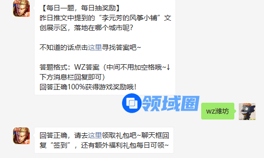 【每日一题,每日抽奖励】昨日推文中提到的“李元芳的风筝小铺”文创展示区,落地在哪个城市呢?不知道的话点击这里寻找答案吧~答题格式:WZ答案(中间不用加空格哦~↓下方消息栏回复即可)回答正确100%获得游戏奖励哦!