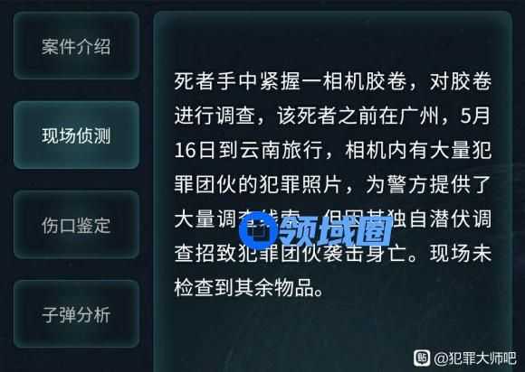 死者手中紧握一相机胶卷,对胶卷进行调查,该死者之前在广州,5月16日到云南旅行,相机内有大量犯罪团伙的犯罪照片,为警方提供了大量调查线索,但因其独自潜伏调查招致犯罪团伙袭击身亡。现场未检查到其余物品。