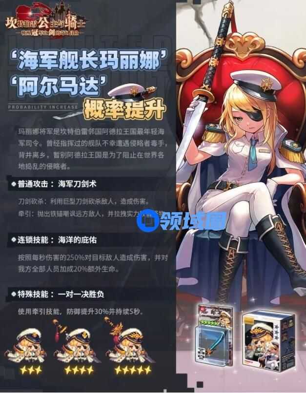 玛丽娜将军是坎特伯雷邻国阿德拉王国最年轻海军司令,她曾经指挥过的舰队不幸遭遇侵略者毒手。失去一起航海的船员,失去与自己肝胆相照的部下,让玛丽娜内疚不已。背井离乡,暂别阿德拉王国是为了阻止在世界各地捣乱的侵略者。目前最高的防御和生命弥补了她没有盾牌的缺陷。专武的AOE在多种场合有非常不错的发挥,比起其他坦克有着更高的输出,并且很适合推图。她的牵引技能让她在角斗场场可以去嘲讽威胁更高的后方角色,在一些阵容的搭配下,有非常不错的表现。