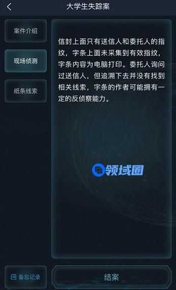 信封上面只有送信人和委托人的指纹,字条上面未采集到有效指纹,字条内容为电脑打印。委托人询问过送信人,但追溯下去并没有找到相关线索,字条的作者可能拥有一定的反侦察能力。