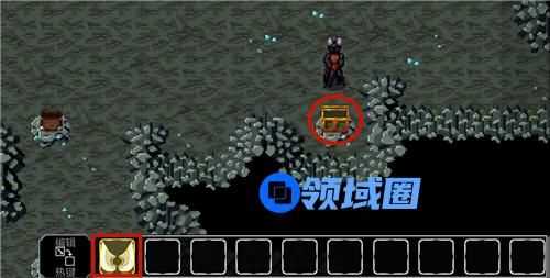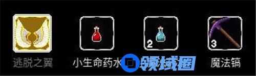 洞穴中会在随机层数随机位置,刷新下图所示的宝箱,开启后会概率获得【逃脱之翼】。(PS:还有可能获得小生命药水、小魔法药水和魔法镐,分别是回血、回蓝和挖属性水晶用的。)