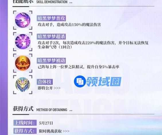 被动:已阵每上阵一位梦之队精灵,提升自身5%暴击率