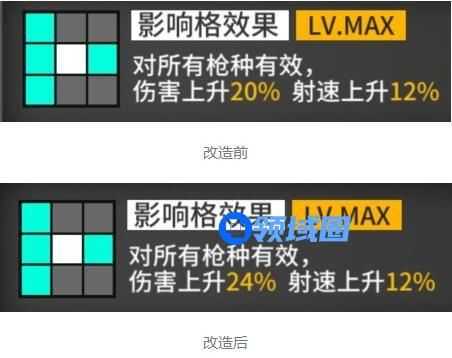 政委的影响格效果本身就是相当不错的,改造后强化了伤害没有继续加射速,整体buff幅度达到38.9%,算是相当可观,虽然目前流行的队伍搭配都会带上50%-100%的命中buff,但是政委2技能本身就带一个高额单体命中buff,搭配另外一个带有50%左右命中buff的HG,足够解决RF夜盲问题。