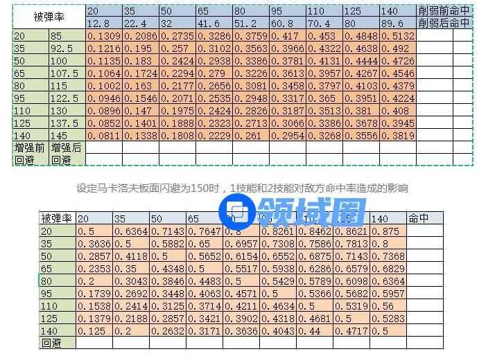 设定马卡洛夫板面闪避为150时,1技能和2技能对敌方命中率造成的影响