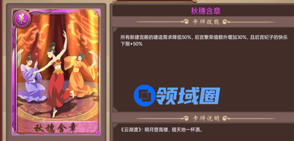 卡牌技能:所有新建宫殿的建造需求降低50%,后宫繁荣值额外增加30%,且后宫妃子的快乐下限+50%。