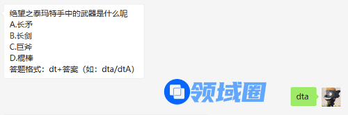 绝望之泰玛特手中的武器是什么呢A.长矛B.长剑C.巨斧D.棍棒答题格式:dt+答案(如:dta/dtA)这是DNF5月10日每日一题,回答正确会有丰厚奖励,游戏宝小编为您带来正确答案。