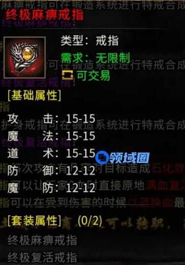 这个戒指每次攻击有几率出现石化效果,携带这枚戒指可以在打怪过程中有几率石化效果。两个同阶的戒指可以获得提升一定的攻击力。