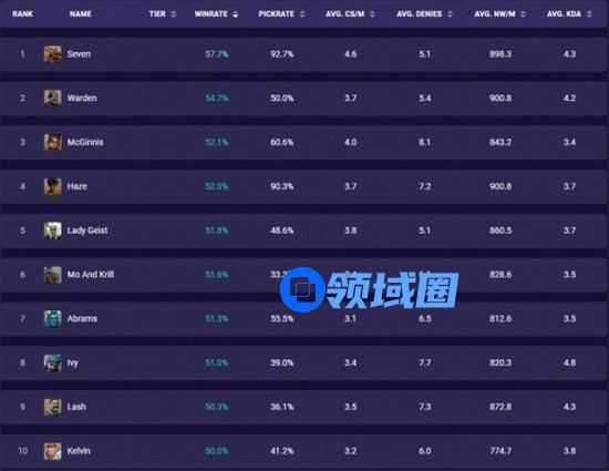 1、按照比赛胜率来看,Seven以57.7%胜率排在第一,选取率92.7%排在第一,目前内测最强英雄当之无愧。