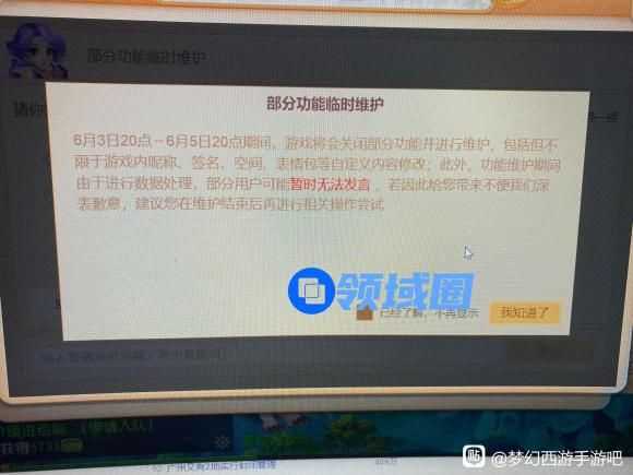 6月3日20点~6月5日20点期间,游戏将会关闭部分功能并进行维护,包括但不限于游戏内昵称、签名、空间、表情包等自定义内容修改;此外,功能维护期间由于进行数据处理,部分用户可能暂时无法发言,若因此给您带来不便我们深表歉意,建议您在维护结束后再进行相关操作资试