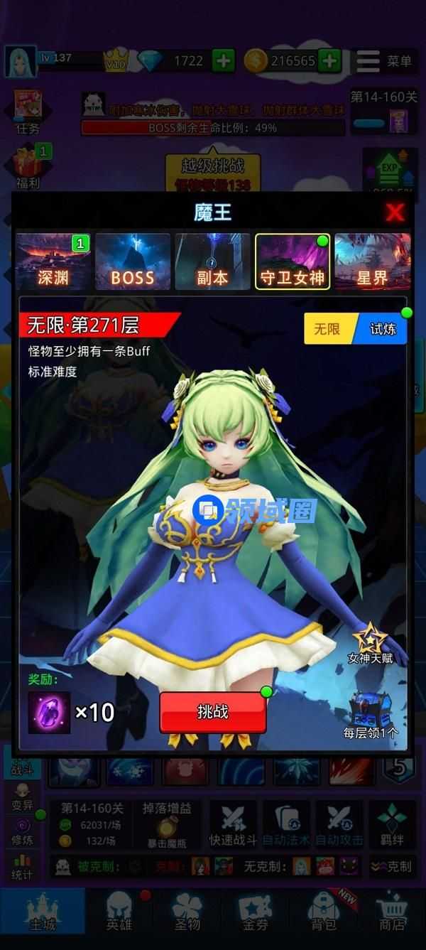 无限模式里每通过一层都会获得一次天赋选择机会,我个人比较推荐优先生存类的,毕竟女神没了就算场上还有其他的英雄也会直接结束。水晶类天赋就差不多了,灾祸减少的可以先不点五千水晶的天赋前面也用不上。并且女神玩法跟我们主阵容的战斗力力是挂钩的,左下角的数值越高通关难度就越小,前期数值不高时最好不要去打试炼,很浪费时间。我七千的时候去打初级需要一分多钟甚至更久,尤其是随机到女恶魔的时候很容易翻车。现在两万五稳定在三十秒一次就舒服很多了。