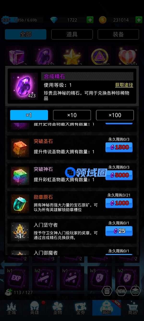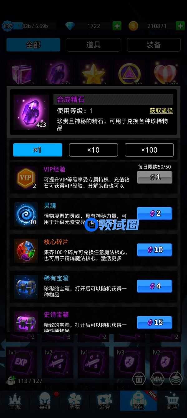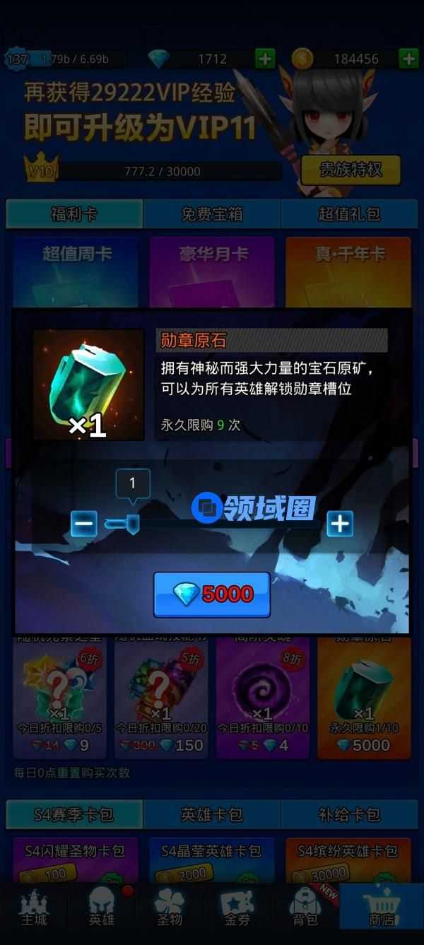 合成晶石可兑换的奖励很多,不过前期推荐的只有一千晶石一个的勋章原石,用来解锁英雄的勋章位置。可以较大的提升我们的战斗力。用钻石购买的话是五千一个,用晶石的话通过试炼以及基础无限女神推图获得。每日通过试炼可以用以三钻一晶石的比例获得,相比于钻石直接购买会实惠很多。并且还可以额外获得大量的经验奖励。vip经验也是比较推荐的,毕竟等级越高好处越多。