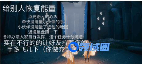 1、向其它玩家传递能量:给快没能量的玩家回复能量(大叫,牵手,点蜡烛),和好友手拉手进一个地图,去云野点亮一个无翼,实在不行的的让好友拉着你的手飞几下(你做充电宝)就行了。