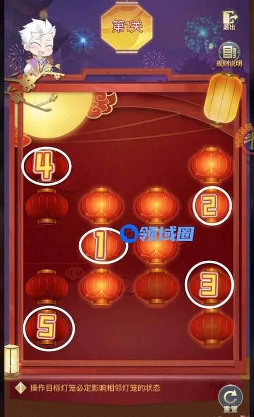 3、通关攻略:实际就是通过点击灯笼,调整明暗,使所有灯笼亮起。可使用反推法通关,如果想要通关,需要灯笼全部亮起,那么就需要最后一步有三个或两个相连的灯笼,能够点击一次就点亮全部灯笼,如剩余暗灯笼在边角,则只准剩余双数,剩余灯笼在中间,则只准剩余单数。