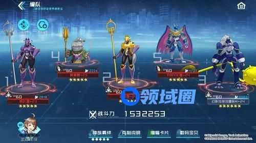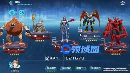2、编队特色:电光暴龙兽与帝皇龙甲兽FM的无视防御能造成非常可观的AOE伤害,正义兽能补足阵容缺乏的单点输出能力,附带错乱插件的古代火山兽,在可以提供分担减伤的同时,为敌方赋予随机的减益状态,为几个输出角色提供触发弱点插件的环境;婆婆兽在阵容中主要担任治疗作用,为队友提供持续的作战能力。