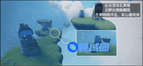 4、在云顶浮石冥想:在云野右侧隐藏图左边残楼前实心建筑旁的石碑前光圈处打坐并留言。