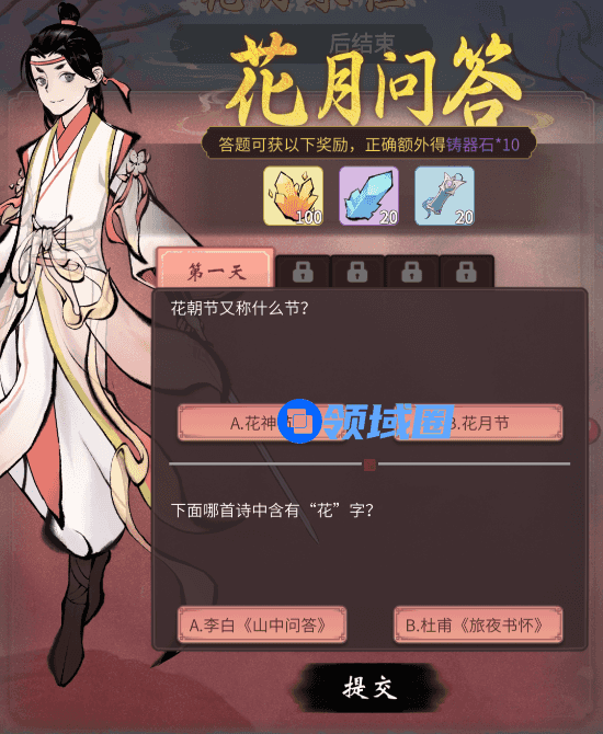 答题活动,持续五天,答题正确可获得:天机石*100、铸器石*30、流云玉简*20