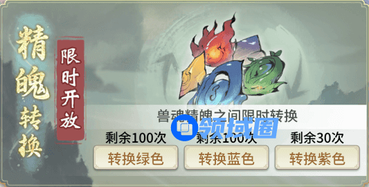 可以消耗任意精魄转为为指定精魄,并且各有限定次数,如想要绿色精魄,可以用任意一个蓝色精魄换两个绿色精魄,或者一个紫色精魄换六个绿色精魄,想要蓝色精魄则是可以用2个绿色精魄换一个蓝色,或者用一个紫色换3个蓝色精魄,紫色同理!