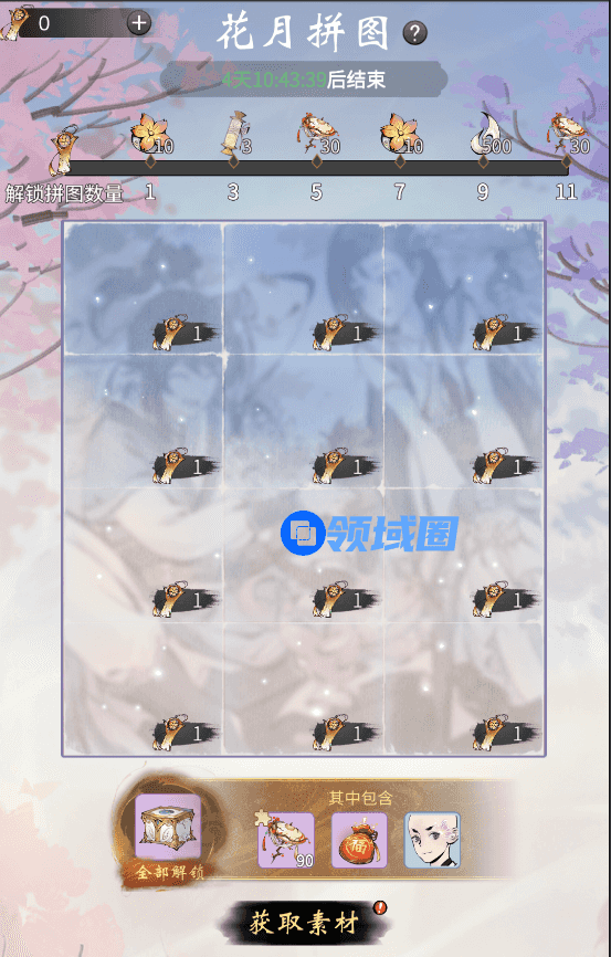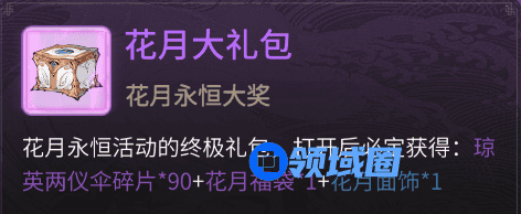 全部拼图都解锁后即可获得花月大礼包,其中包含琼英两仪伞碎片*90、还有消耗寿命有几率开出时装的礼包以及面饰!