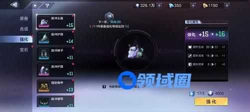 4、点评:强化是一次性,也是永久性,因此不管在什么时候都可以强化自己,因此后期强化概率不是很高,推荐大家前期强化10即可,后期主资源多了在考虑,因为有11个部件,消耗材料还是很多的。