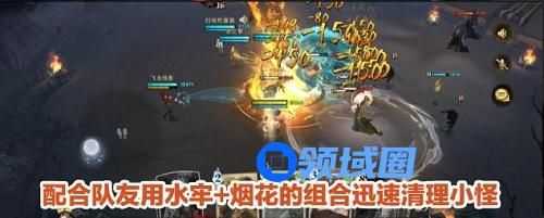 2、配合队友用水牢+烟花的组合迅速清理小怪。