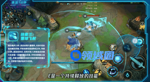 E(3)技能是一个持续释放的技能,要一直摁住E(3)技能,敌方受到E(3)技能的次数越多,伤害越高,禁锢时间越久。在这里值得一提的是,E(3)技能的最大长度和禁锢圈是不一样的,丢雪球的减速距离比禁锢圈要大,所以可以在最大释放范围内,就先手放E(3)技能,造成敌方减速之后慢慢贴近,保证禁锢时间的最大化。