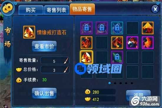 玩家操作寄售的界面,包括选物品、输入数量、制定出售价格、查看市价等。