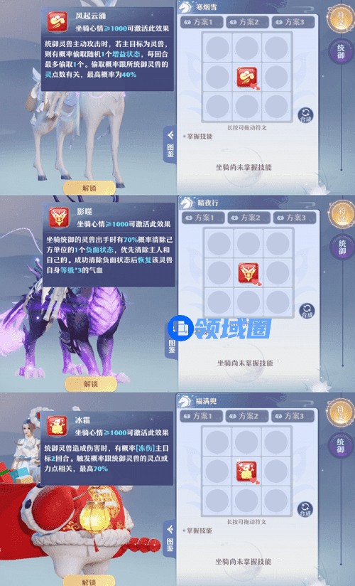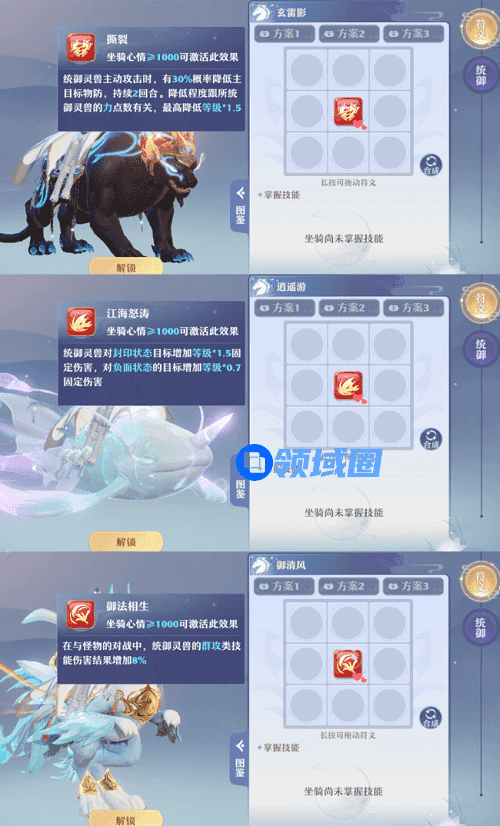 输出型坐骑有玄雷影、逍遥游和御清风,玄雷影的技能效果是概率降低对面的物防,这其实就是一种变相的增加己方输出,尤其是搭配物理门派使用效果更佳;逍遥游的技能效果是对封印和负面状态的目标,造成额外的固定伤害,比较适合搭配封印门派使用;御清风的技能更加简单粗暴,统御灵兽在使用群攻类技能的适合最终伤害增加8%,但需要注意的是,这个效果只能用于PVE,所以搭配拥有AOE的灵兽使用最佳。