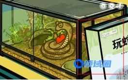 Ø 来到这面墙。点击这个箱子可以看到小绿养的蛇。蛇似乎包裹着什么东西,但是无法获取。通过查看【玩蛇】可以知道蛇矗喜欢吃什么,选中【柠檬】或者【橙子】点击蛇矗,他将会钻到洞中,然后使用【钓鱼竿】,将玻璃钢中的木头取出,