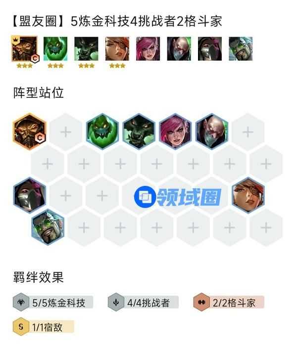 1.如图,阵容由炼金,狼人,奎因,蛮王,扎克,烈娜塔,德莱文以及蔚组成,构成了五炼金科技,四挑战者,两格斗家,一宿敌的羁绊,八人口成型,上九后可以上杰斯开出执法官,也可以下蔚补上两个炼金英雄开出七炼金科技搭配四挑战,也可以六挑战搭配五炼金科技,但总体体系不变。要注意的是:第一点,这套阵容中的两星辛吉德>一星的维克托,一个稳定的控制比不稳定的伤害靠谱多了,但如果维克托可以两星且有希尔科帮助启动,则可以换下辛吉德。第二点就是,奎因这张卡在挑战者阵容体系中,也是大于卡莎的,后期除非是少法术输出,才可以用两星卡莎换奎因。