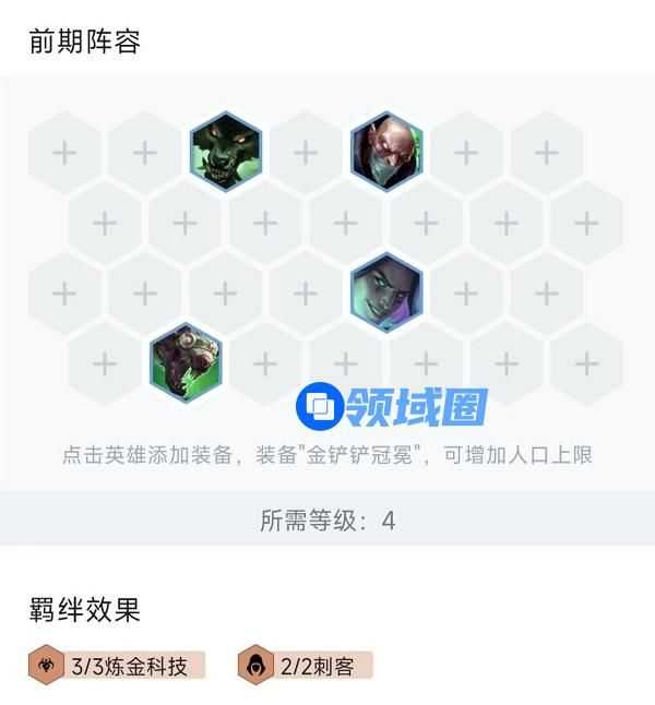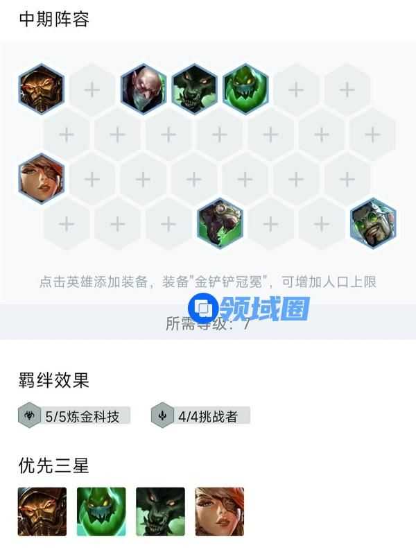 6.七人口时,卡着经济搜出阵容牌的三星,留牌顺序为:蛮王>扎克>奎因>狼人,这时开出五炼金科技+四挑战,三星后上八人口即可,补上蔚或者希尔科,再观察场上情况来选择是否上九人口。总的来说,这个版本虽然没有以前四费的蛮子勐,但仍然是一套大成后可吃分阵容,后期要看高费卡的质量与装备来决定是否可以吃到鸡,但还是推荐大家可以去玩一玩。