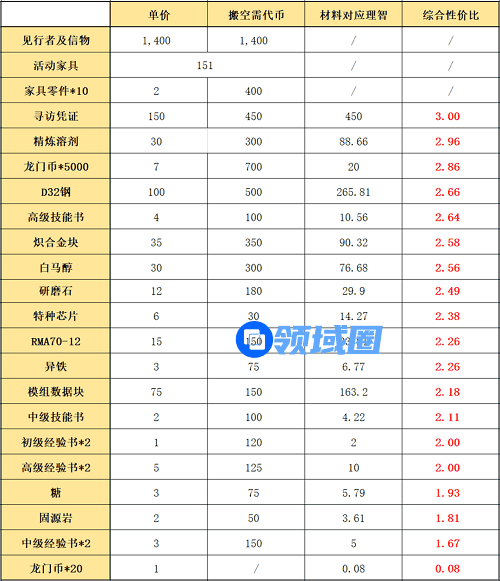 2、所长这里将所有材料进行了理智的等价换算,其中关卡掉落的素材(糖组、凝胶、扭转醇)按照活动图掉率计算,其他材料则根据主线掉率。优先级由高到低(按照主线最高掉率计算,不考虑副产物产出;橙色紫色的材料由低级材料合成计算;合成材料所消耗的龙门币进行了折算),具体如下: