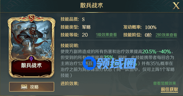 散兵战术可提高主将的兵力回复,并使副将大幅提高伤害和治疗加成,但负面效果是副将的承伤也随之提高。