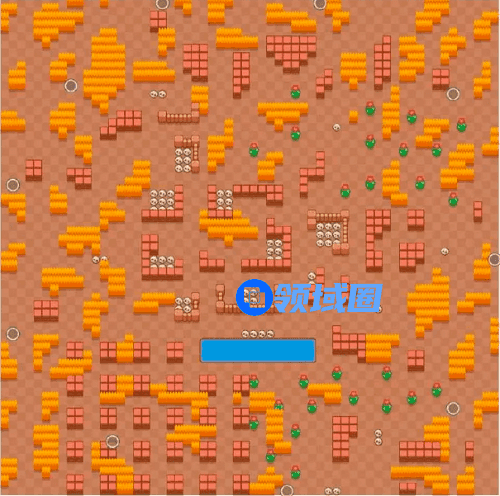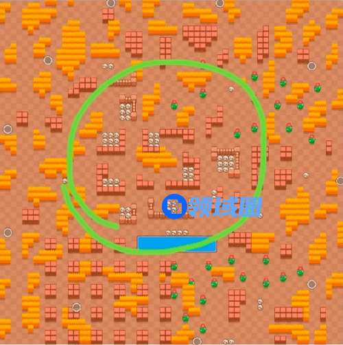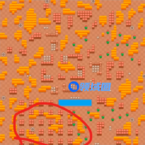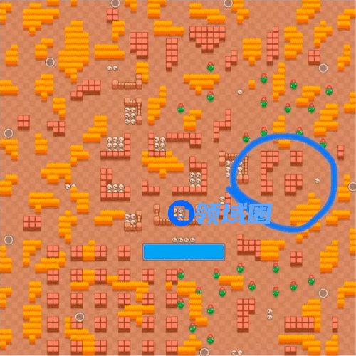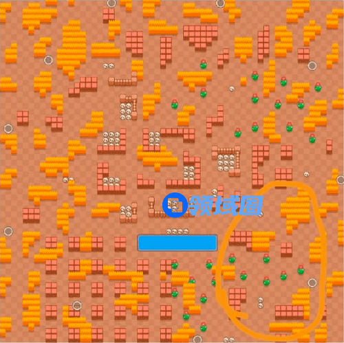 9、右侧黄圈区域适合于在仙人掌和墙体交界处出生的英雄在抢夺左侧能量块后与上方英雄的对线,此处仙人掌极多,柯尔特、普利莫一类破墙英雄占优势,贝亚不推荐在此处进行对线,比比、大锤也不适合在此处作战,喷子对此处地形没有要求。