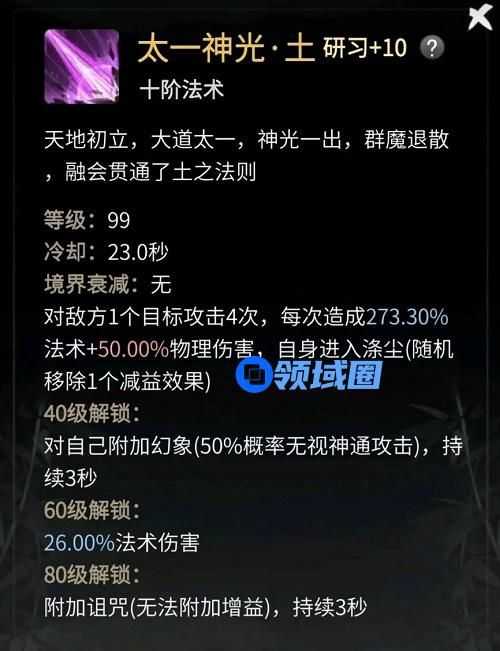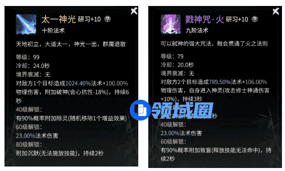 个人认为当前版本仙法必带的神通。戮神火致盲骗关键技能、太一沉默保盾都是仙法几乎必备的技能。太一自身倍率非常出色,可以轻松破千;戮神火作为主打功能性的神通,其20秒的cd足够弥补倍率上的不足。
