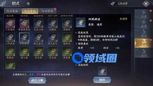 5、内功可以根据获取难易程度自行搭配,前期可以使用绿色、蓝色内功过渡,紫色内功为核心,后期则可以收集金色和红色的稀有高级内功。
