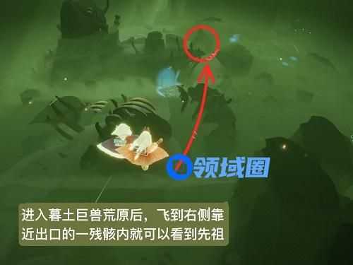 1、音韵季的骑士礼先祖位于暮土巨兽荒原的后方,玩家进入土木巨兽荒原后,飞到右侧靠近出口的一处残骸内就可以看到先祖了,具体位置看红圈。
