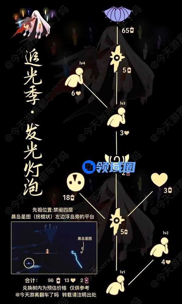 2、兑换三角额纹面具、幽蓝斗篷、噤声动作所需价格为2根红蜡烛、96根白蜡烛、13颗爱心,兑换树内为预估价格,仅供参考。
