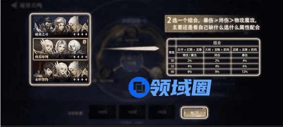 3、选一个组合,爆伤>终伤>物攻魔攻,主要还是看自己缺什么选什么属性配合。