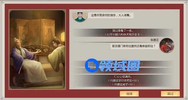 9.结识尚宝监掌印后,回合结束概率触发购买材料事件。对商学及算术有一定要求,也可派遣门客前往,完成度90以上亲密度+50,威望+50。不足90亲密度+30威望+30.