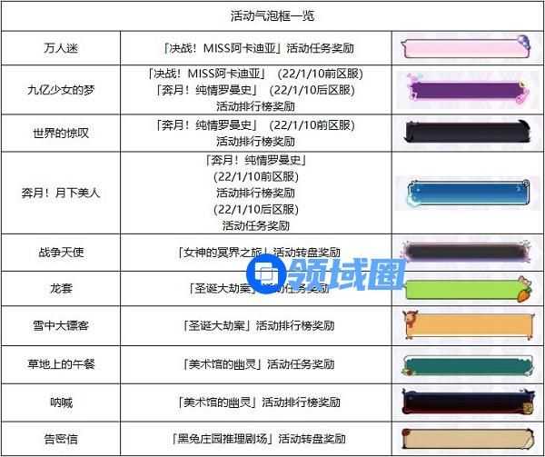 注1.活动排行榜获得的气泡框均为绝版气泡框,备忘录活动(复刻活动)中无法获取。