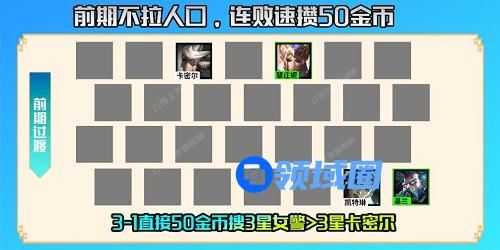 11.前期阵容:前期不拉人口,建议走连败运营思路,开局2-1有10金币,2-3有20金币,2-5有30金币,2-6有40金币,2-7有50金币,这样在3-1就能够有60+金币去抽卡了。3-1直接全部搜光追3星女警>卡密尔,当前版本一费卡基本没有人赌,只要运营不是特别背基本都能够追到3星女警。女警一到3星就马上拉人口去找杰斯开出4执法羁绊。