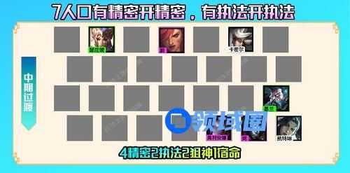 12.中期阵容:7人口开出4精密2执法2狙神1宿命羁绊,4精密能够增加高额的攻速,搭配女警的平A能够打出不错的单体伤害。其次精密里面的基兰和发条两大控制能够弥补阵容缺少控制这一致命缺点。7人口只要找到核心体系卡牌就可以直接拉8人口找杰斯开4执法。