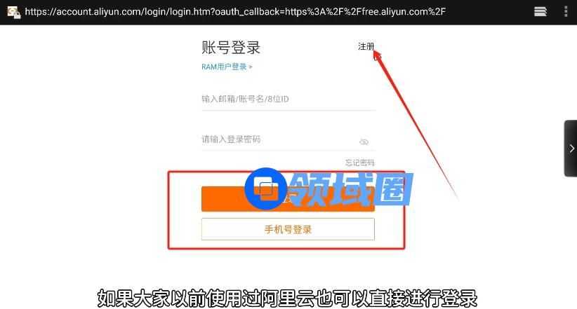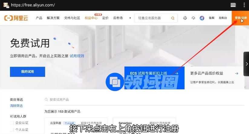 2、接下来点击右上角按钮进行注册,如果大家以前使用过阿里云,也可以直接进行登录。登录完毕后回到这个界面,然后往下翻找。