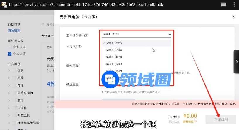 4、点击试用按钮,试用后可获得800小时的时长。附属区域选择距离自己近的,我这边就随便选一个。