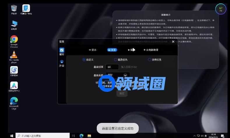 11、上面的悬浮窗是云电脑的基本菜单,可根据喜好自行调整缩放比例与分辨率。