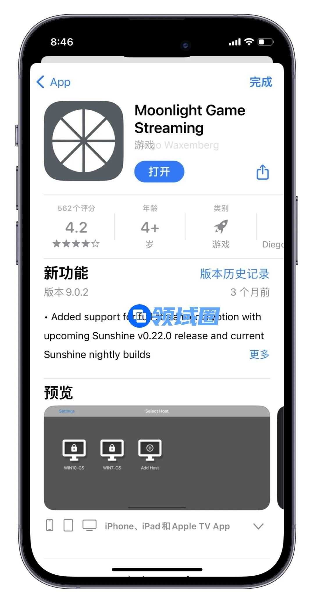 1、首先下载Moonlight Game Streaming:这个是我们需要在iOS上面安装的应用,它可以将Windows电脑画面传输到其他操作系统的客户端软件上,最高支持4K,支持键盘鼠标、手柄、触摸屏、触控笔,无广告,完全免费。通过Moonlight我们可以实现在手机上运行主机、 远程同屏追剧、单机双人游戏,更不用说植物大战僵尸了,英雄联盟、永劫无间、剑侠情缘也能玩。