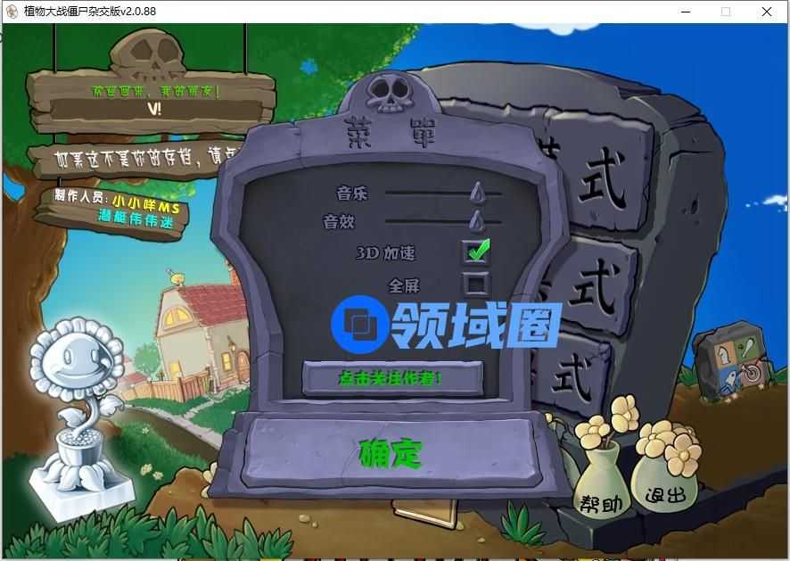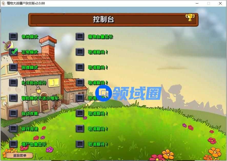 2、点击选项-勾选全屏,游戏难度模式可以在右下方位置进入控制台,包括僵尸血量显示、植物血量显示、自动收集、游戏加速、不送小推车等等功能。