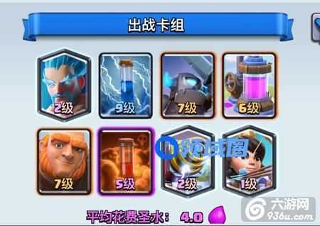 电磁炮+寒冰法师+公主+巨人+小皮卡+圣水采集器+电击法术+毒药