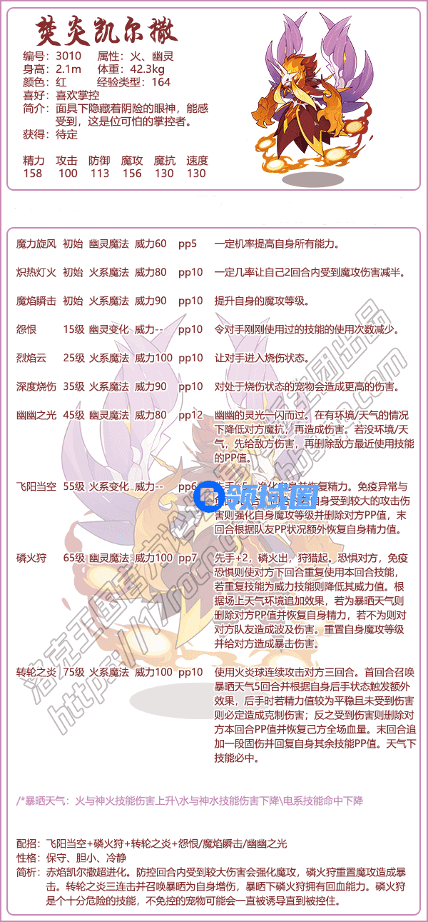 4、简析:赤焰凯尔撒超进化。防控回合内受到较大伤害会强化魔攻,磷火狩重置魔攻造成暴击。转轮之炎三连击并召唤暴晒为自身增伤,暴晒下磷火狩拥有回血能力。磷火狩是个十分危险的技能,不免控的宠物可能会一直被诱导直到被控住。