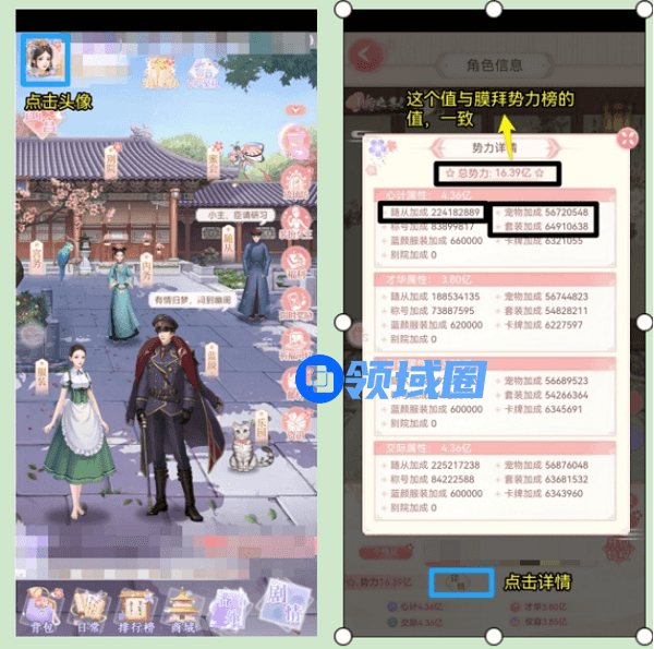 势力详情图:点击【头像】,再点【详情】,就可以看到势力的组成部分。